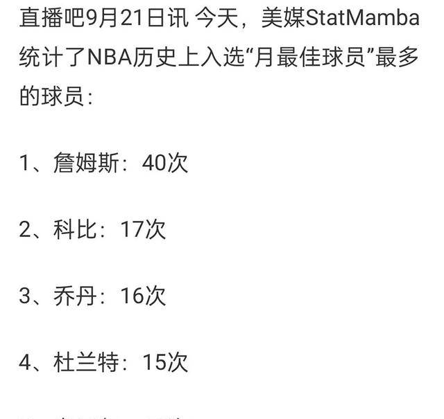 NBA走过78年的岁月,詹姆斯一个人获得的月最佳次数几乎相当于乔丹与科比的总和。而杜兰特和奥尼尔也只是分别获得15次和12次,这让詹姆斯的这一成就愈显得不可超越。如同乔丹的10个得分王和拉塞尔的11个冠军戒指一样,詹姆斯的40次月最佳也将成为无法追赶的传奇。